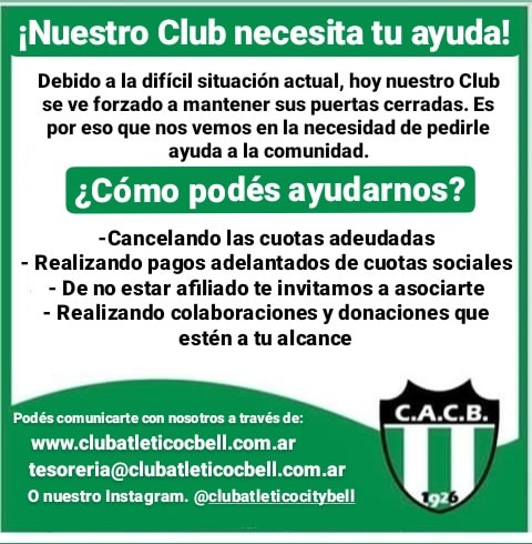 ¡Nuestro Club necesita tu ayuda! Estimados socios y amigos: Descargá la Ficha de Solicitud de Ingreso, completala y reenviala a nuestro mail clubatleticocitybell@hotmail.com Si podés darnos una mano, después envianos el comprobante a tesoreria@clubatleticocbell.com.ar indicando nº de socio, apellido y nombre y cantidad de cuotas adelantadas. GRACIAS!! |